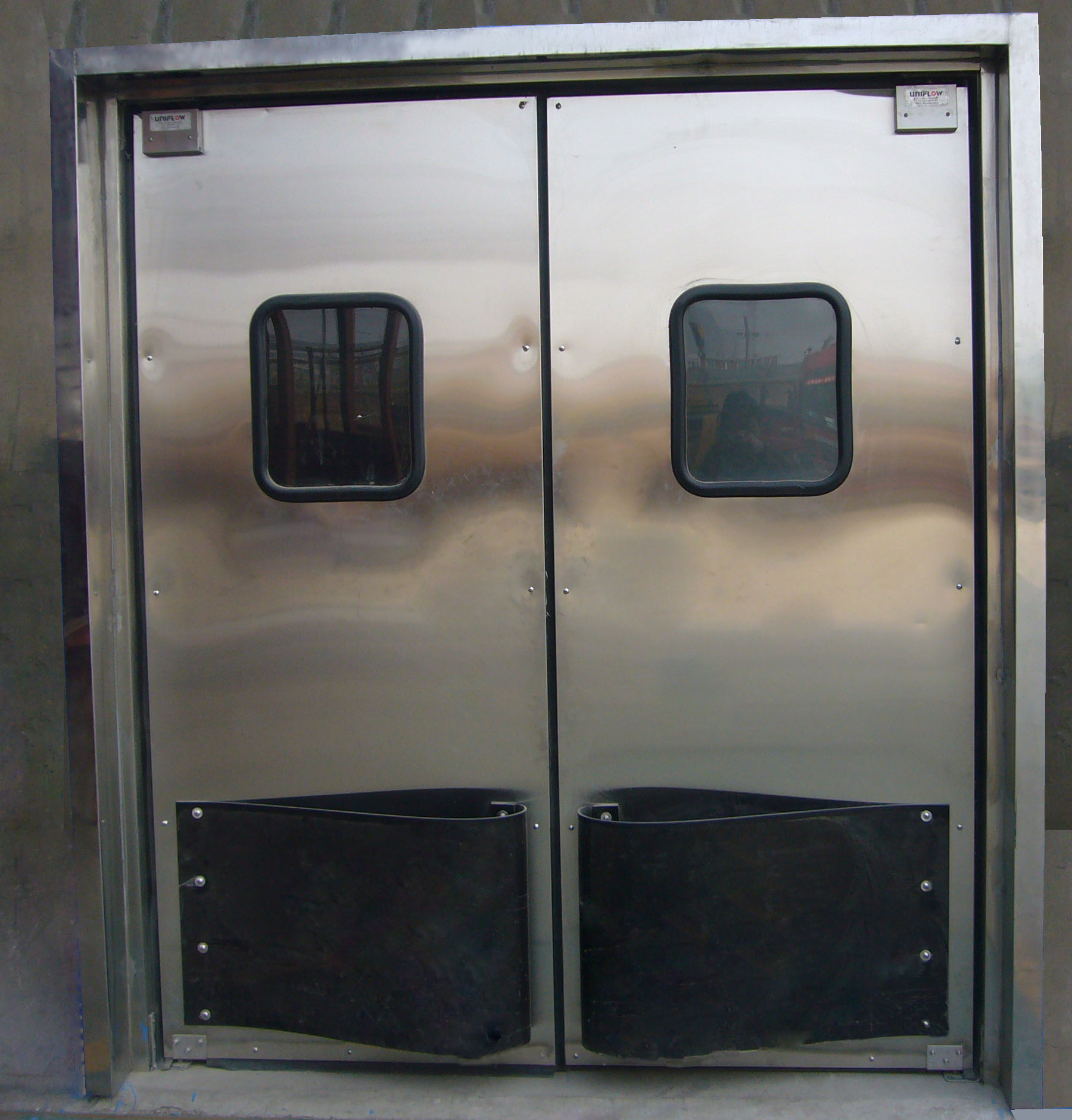 自由門隔熱門(mén)板或非隔熱門板。隔熱型門板門芯為聚氨酯發(fā)泡,非隔熱型門板門芯為木質材(cái)料。特點均為抗衝擊強度高、隔 音效果好、壽命長。該係列自由門(mén)的設計完全符(fú)合國標(biāo)安全衛生(shēng) 標準。門板輕(qīng)便(biàn)、重(chóng)量僅為(wéi)12.2kg/㎡,容易開啟,操作平穩,允 許人員安全通過,並(bìng)不會對設備造(zào)成任何的損(sǔn)壞。整體門板厚度是48mm ,外皮厚度在3.2mm ,交叉連接的聚乙烯外在400F同樣可以保留它的特性。窗3.2mm厚聚碳酸酯窗戶,鑲有黑色鋁合金(jīn)框 架,從門(mén)板表麵凹(āo)進去至少 厚,用於保護窗戶的表麵由於 負荷而引起的磨損,內部的加固門的主體和背麵邊緣的內部用鋼 管加(jiā)強,保證了門板的水平麵和(hé)門板的堅固性。密封持久耐用密 封是適(shì)用於工廠應用的,沒有使用那些金屬條或是緊(jǐn)固件,製造 這(zhè)種密(mì)封替換是容易的.絕緣的核心內部(bù)的聚氨脂發泡材料(可 以永久的與外表皮相連(lián))不會因衝撞(zhuàng)而脫離,並有良好(hǎo)的隔音性 和極好的絕緣性。